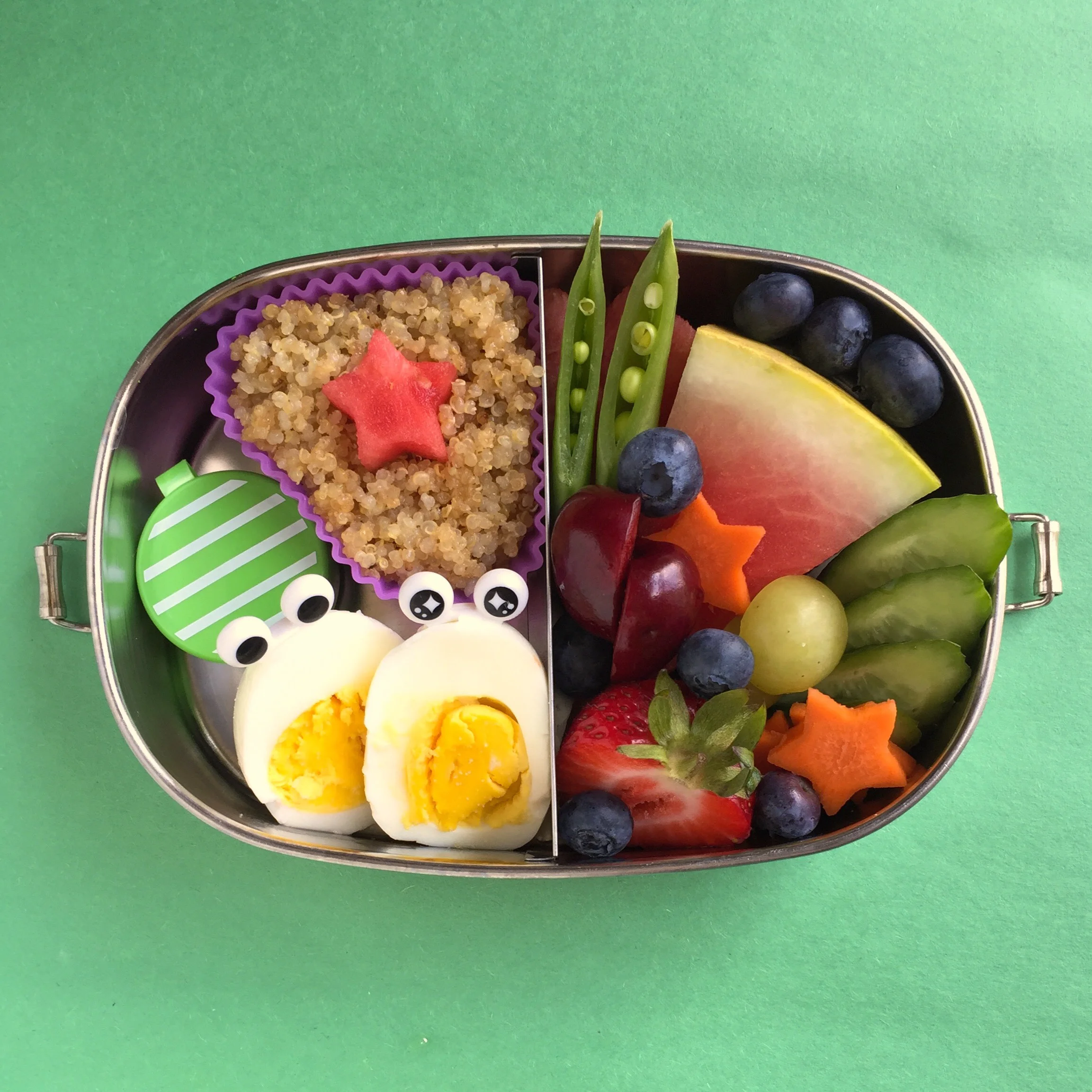 Use colored silicone muffin cups or cute food picks for fun. Mini cookie cutters are great for cutting fruits and veggies into shapes. If you’re introducing a new vegetable, you can pull out a Tater Tat to make it more exciting. My kid gets a kick out of wearing asparagus and then seeing it in his lunch. Just one or two cute touches make lunch fun without costing you tons of time.